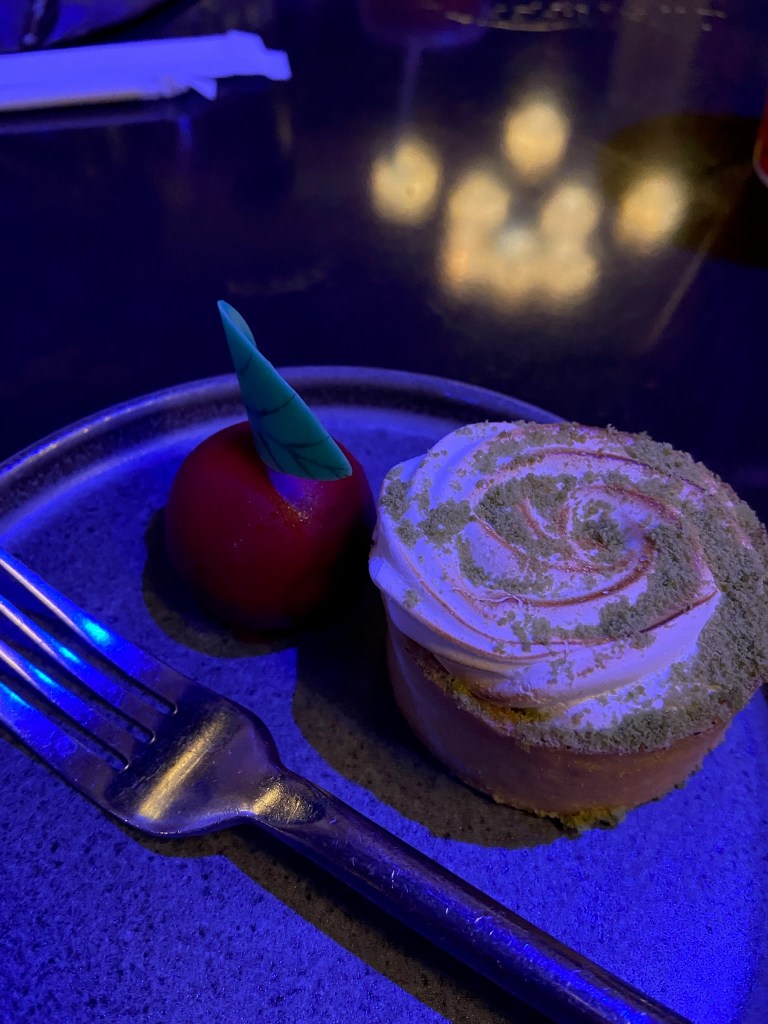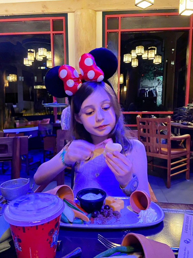 Our meal at Artist Point’s Story Book Dining was a highlight of our trip. While we had a reservation for our dinner, we still had to wait quite a long time to be seated, but it was worth the wait. The food was creative, beautifully themed and delicious. The characters were fantastic and there was entertainment throughout the dinner. I can’t recommend this experience enough. We even enjoyed the boat ride to Disney’s Wilderness Lodge, which made the meal more special and memorable.